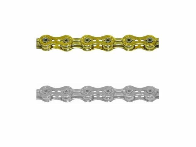 En acier fortement allié, super léger et solide, avec axes creux et maillons usinés, revêtu de nitrure de titane Ti-N doré.