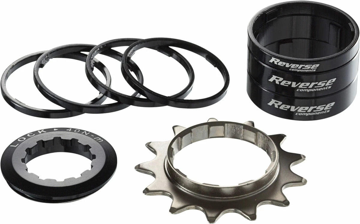 Avec le kit de conversion mono-vitesse de Reverse Components, il est possible de convertir un moyeu conventionnel avec corps de roue libre en mono-vitesse. Afin de garantir une ligne de chaîne droite, le pignon peut être positionné de manière optimale sur le corps de roue libre grâce à un total de sept entretoises différentes.