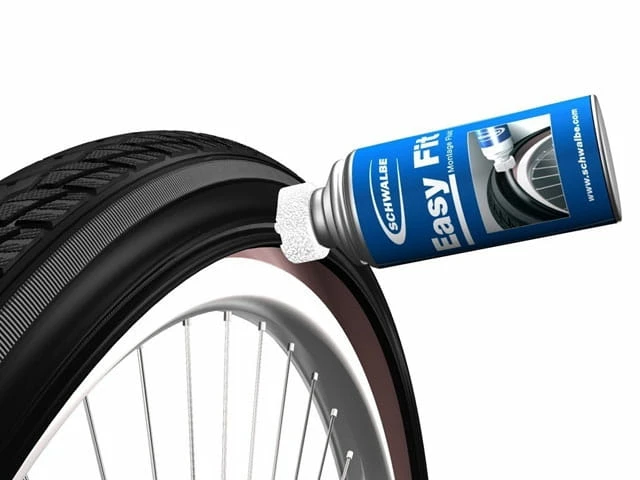 Fluide de montage spécial pour les pneus de vélo. Grâce à la boîte éponge pratique, le fluide peut être appliqué sur le talon du pneu très facilement – sans outils et sans doigts gras.
